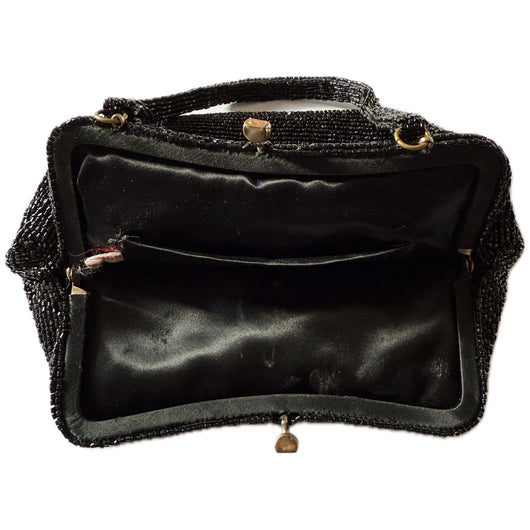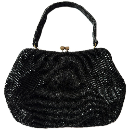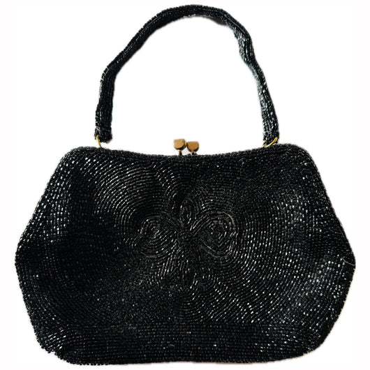 Elegant vintage 1950s evening bag fully covered in delicate jet black glass beads, with a fleur de lis style motif to the centre front.