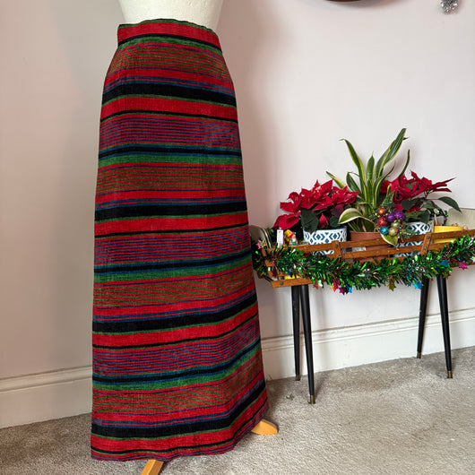 Excellent quality vintage 1970s maxi by Graham Price, in sumptuous thick chenille in festive tones of red and green with blue and black in horizontal stripes. So soft you won't be able to keep your hands off it! Fully lined in acetate fabric.