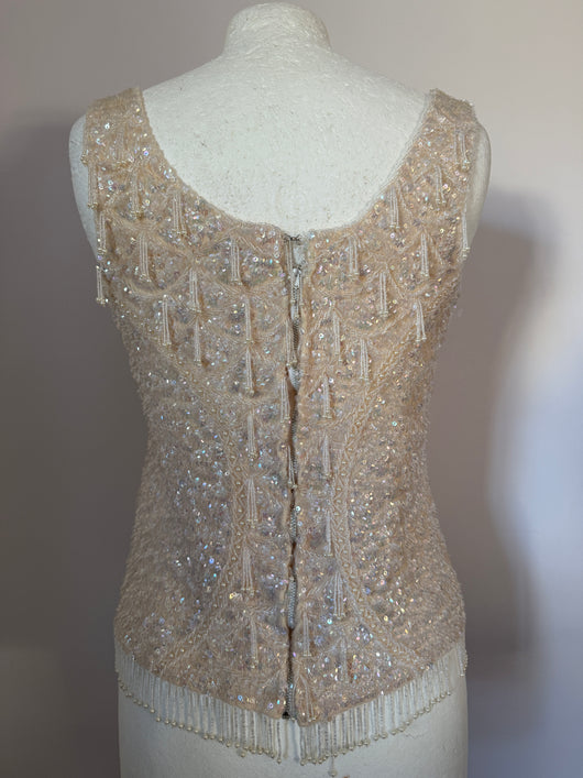 A vintage classic 1950s hand-beaded and sequinned top in 100% wool, in cream.