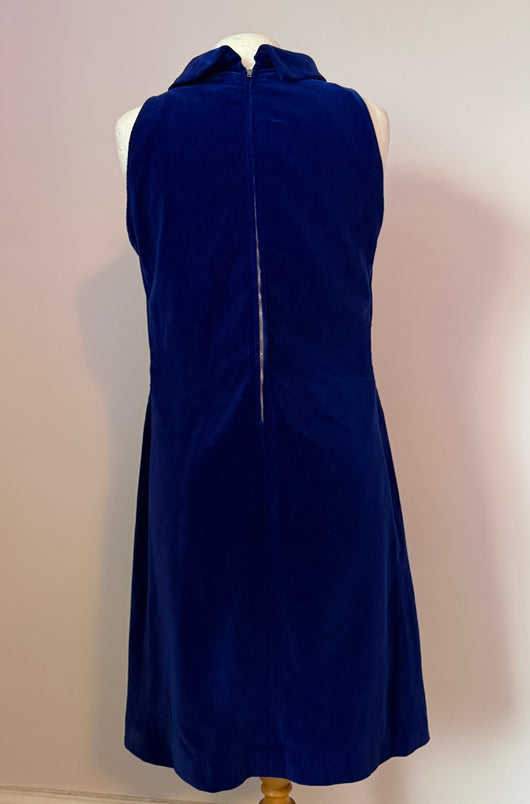 Elegant vintage 1960s cocktail dress in sapphire blue cotton velvet, with rows of small faux pearl beads emanating from the folded collar down the bodice. High cut arms, and keyhole detail to the centre bust. Fit and flare shape, with metal zip to the centre back.