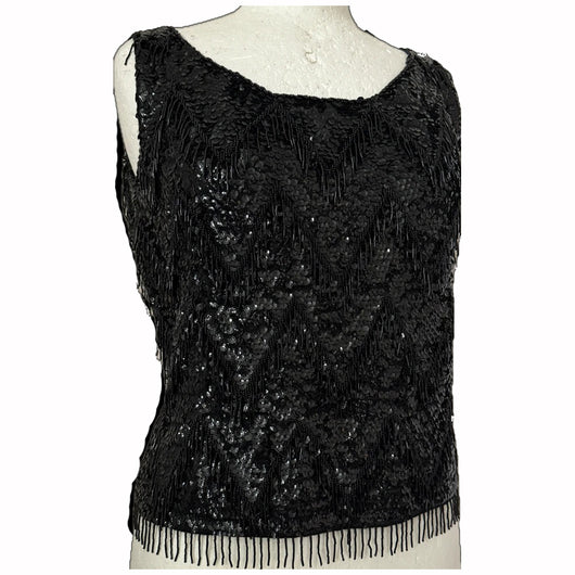 A vintage classic 1950s hand-beaded and sequinned top in 100% wool, in jet black.