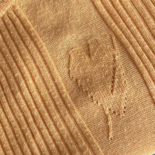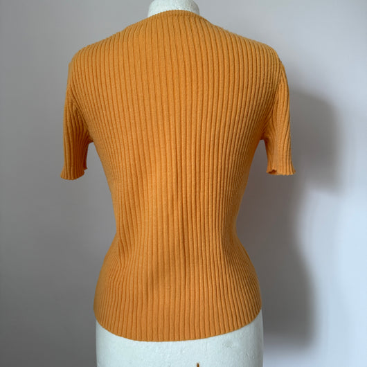 Sweet short sleeved jumper in light amber orange acrylic ribbed knit, with little heart motif pabel to the left chest.