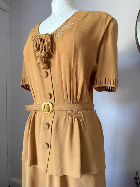 Amber yellow rayon art deco belted 1940s day dress