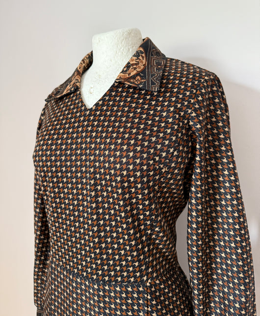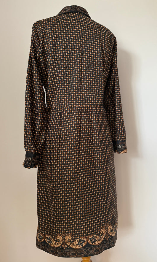 Chic vintage 1970s polyester day dress in black, with contrasting brown and beige dogtooth check, with contrasting paisley pattern to the collars, buttoned cuffs and hem.
