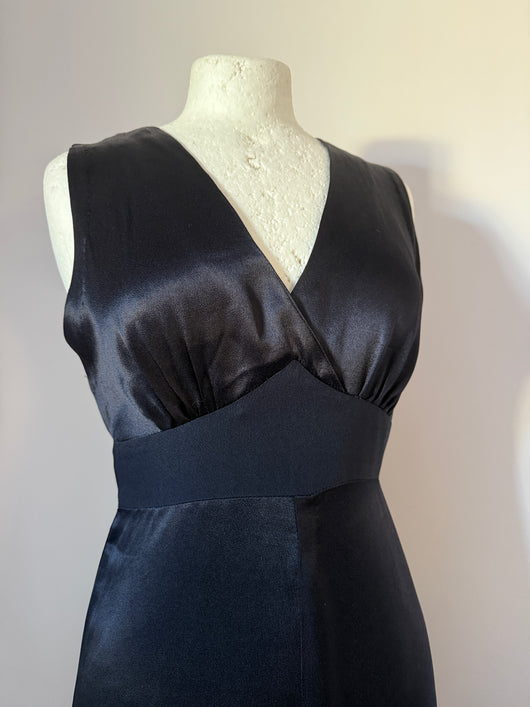 Sleek, demure vintage 1970s cocktail dress by the fondly remembered Chelsea Girl, in slinky black satin fabric with contrasting crepe panel to the midriff, and ties to fasten around the back of the dress. V-neckline with crossover detail to the bust, high seamed waist and gently flared skirt, reminiscent of 1930s and 40s glamour.
