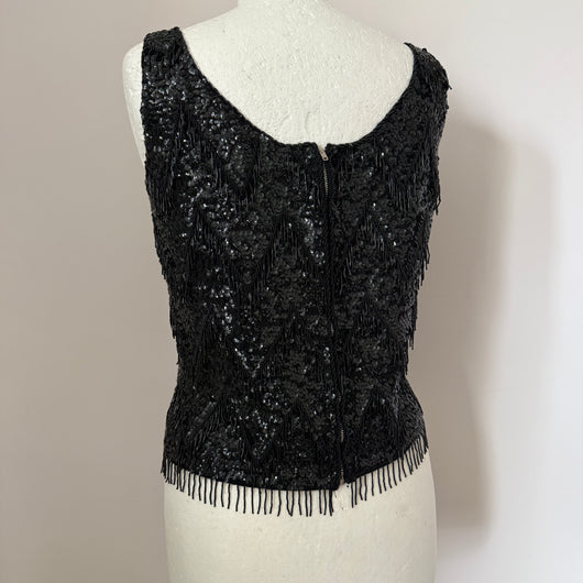 A vintage classic 1950s hand-beaded and sequinned top in 100% wool, in jet black.
