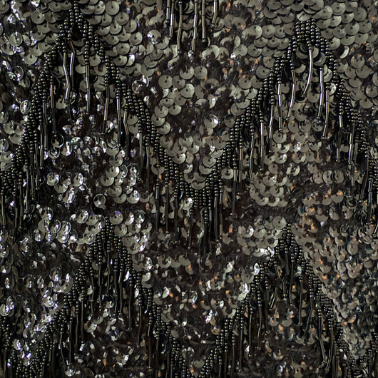 Perfect for shimmying in, this top has thousands of hand-applied sequins, with an unusual art deco design featuring beaded fringed zigzags on a sequinned background. Glass beaded trim to the arms and neckline, and beaded fringing to the hem.