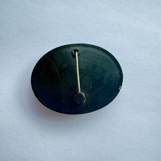 Adorable and collectible art deco era vintage brooch from the 1930s-40s, featuring a cute black Scottie dog on a yellow background, framed in black. Oval shape, with pin clasp to the reverse. Early plastic.